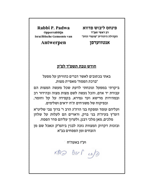 Birkat HaPesach Mehadrein Matzot baked in the Birkat HaPesach Matza Factory in Sderot. The Whole Wheat is under the label: Matzot Shmurot L'Mehadrein Under the supervision of: Rabbi Pinchas Padwa, shlita BELZ, Rabbi of the Belz community in Zurich and as the Kosher Administrator to the Israelitische Religions Geselschaft in Zurich, Rabbi Moshe Bransdorfer shlita, Av Beit Din of Heichal Hora’ah, Jerusalem, OU (Orthodox Union) Kosher is the world’s largest and most widely recognized kosher certification agency.